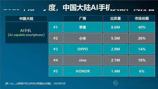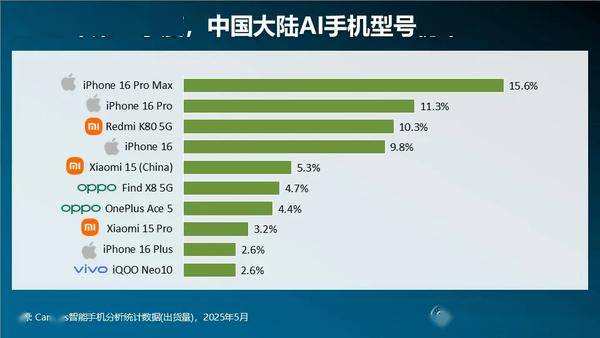 将目光转向中国大陆市场,苹果在2025年第一季度的AI手机销量中依然保持领先地位,但其优势相比全球市场有所缩小。小米紧随其后,位列第二。OPPO、vivo和荣耀则跻身前五名。在AI手机型号榜单上,苹果有四款机型进入前十名,并占据了冠亚军的位置。小米也有三款机型上榜,而OPPO和vivo(包括其子品牌iQOO)则分别有2款和1款机型入围。