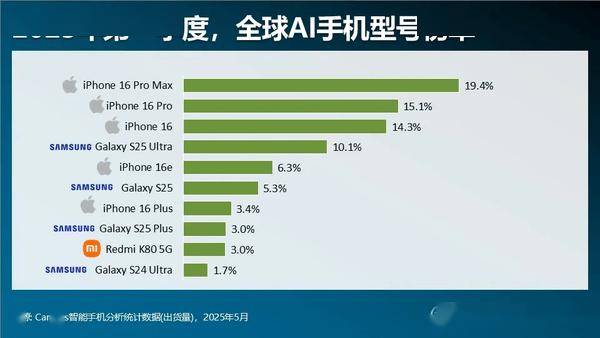 从具体机型来看,苹果和三星在全球AI手机市场中的领先地位更为突出。在2025年第一季度全球AI手机销量前十的机型中,苹果占据了五个席位,并且前三名均被苹果机型包揽。三星也有四款机型上榜,其中S25 Ultra的表现尤为亮眼。而唯一一款进入前十的中国国产机型是红米REDMI K80 5G,位列第九。