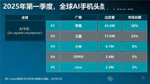 在2025年第一季度,全球AI手机市场的竞争格局中,苹果公司以显著优势占据领先地位。据统计,苹果在该季度的AI手机出货量高达4360万台,占据了超过一半的市场份额,达到了58%。紧随其后的是三星电子,其出货量为1700万台,市场份额为23%,虽然与苹果相比仍有差距,但依旧稳固了其市场第二的位置。中国的小米、OPPO和vivo三家厂商虽然也位列全球AI手机市场的前五名,但在出货量上与苹果和三星相比,存在明显的差距。具体而言,小米、OPPO和vivo的市场份额分别为8%、5%和3%。